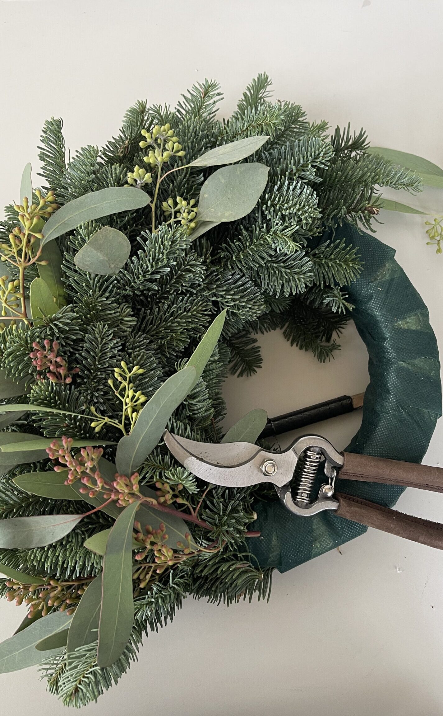 Ob Tür oder Tisch, wir binden gemeinsam einen Kranz mit Tanne, Eukalyptus und Zapfen.