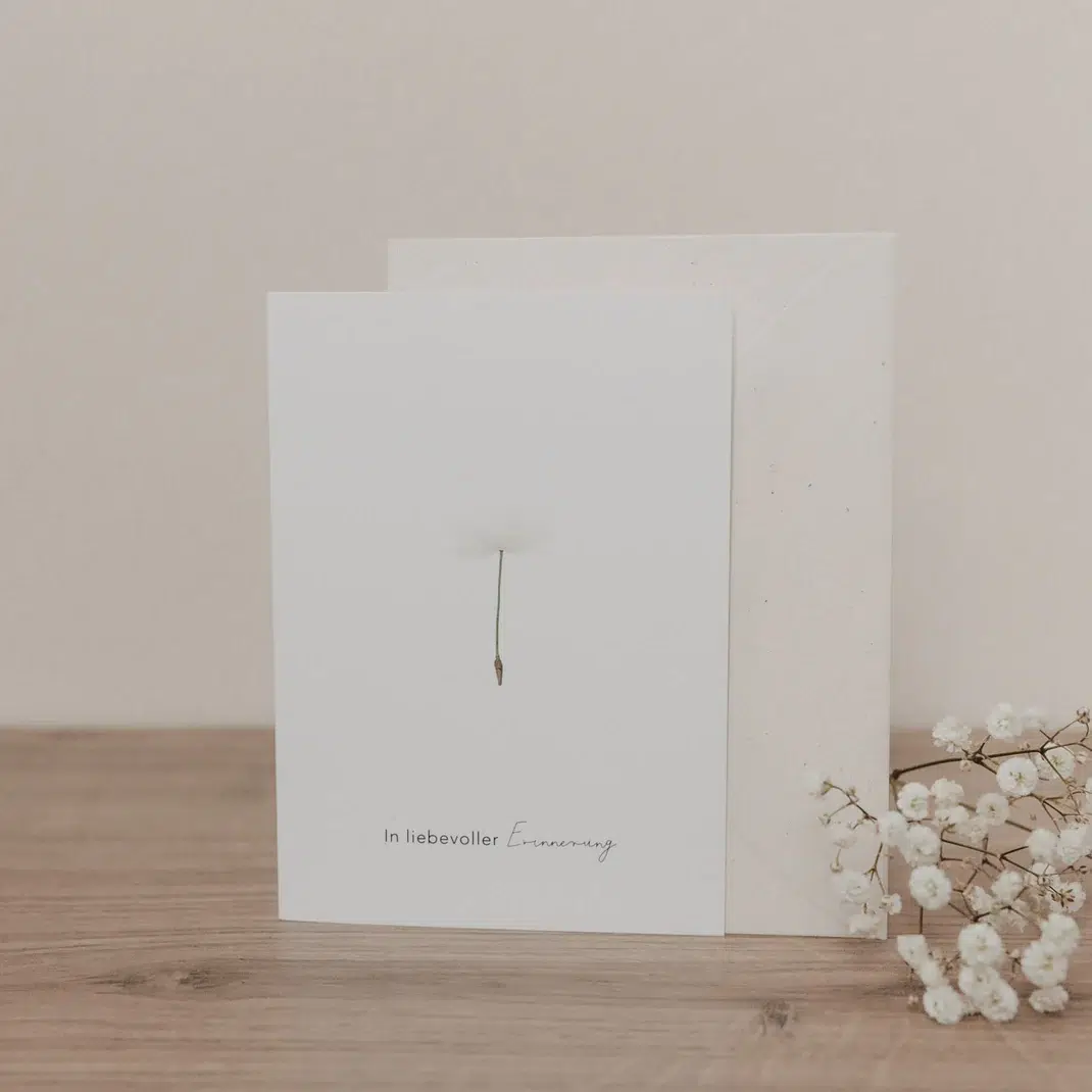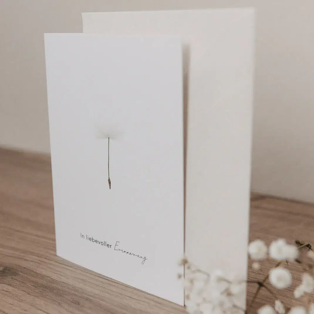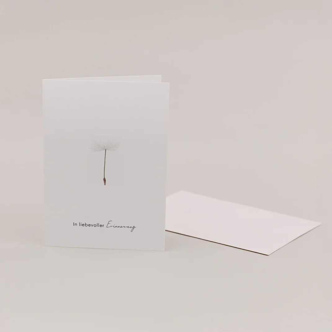 Das zurückhaltende Design eines filigranen Pusteblumensamens unterstreicht die liebevolle Botschaft. Die Klappkarte bietet im Inneren Raum für persönliche Worte des Mitgefühls. Ob als Beileidskarte oder zur Erinnerung an einen besonderen Menschen – diese Karte hilft, Gefühle auf einfühlsame Weise auszudrücken.