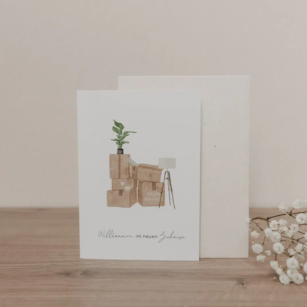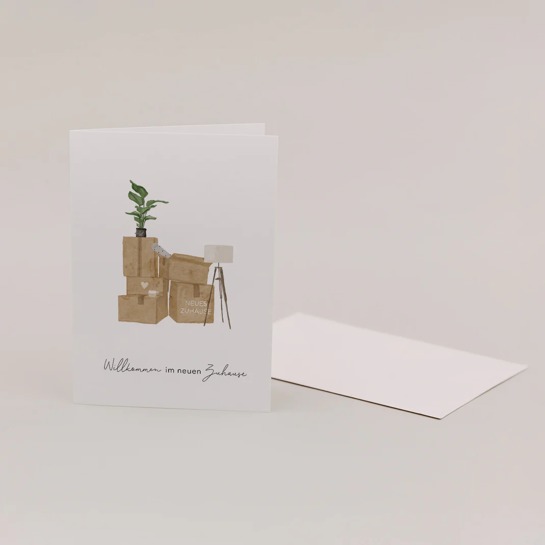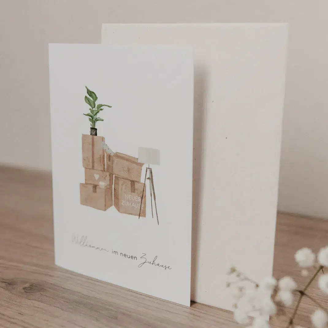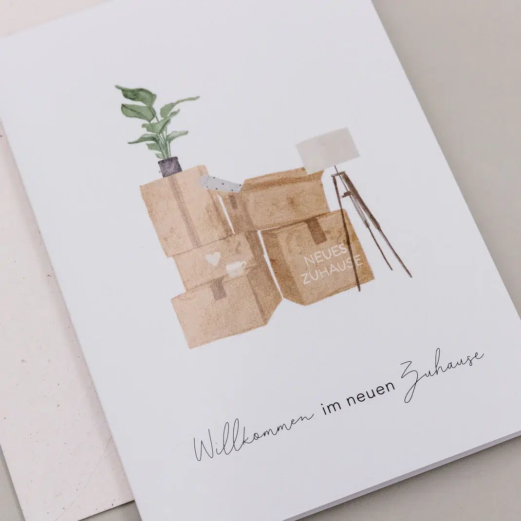 Die liebevoll gestaltete Illustration mit Umzugskartons fängt die aufregende Zeit des Umzugs perfekt ein und macht die Karte zu einer besonderen Botschaft voller Wärme und Freude.