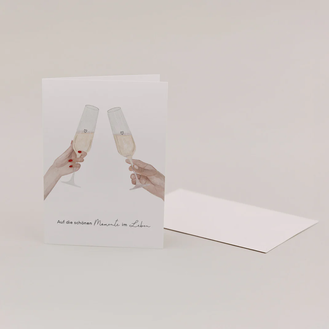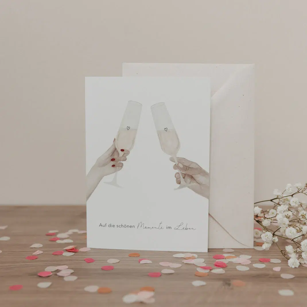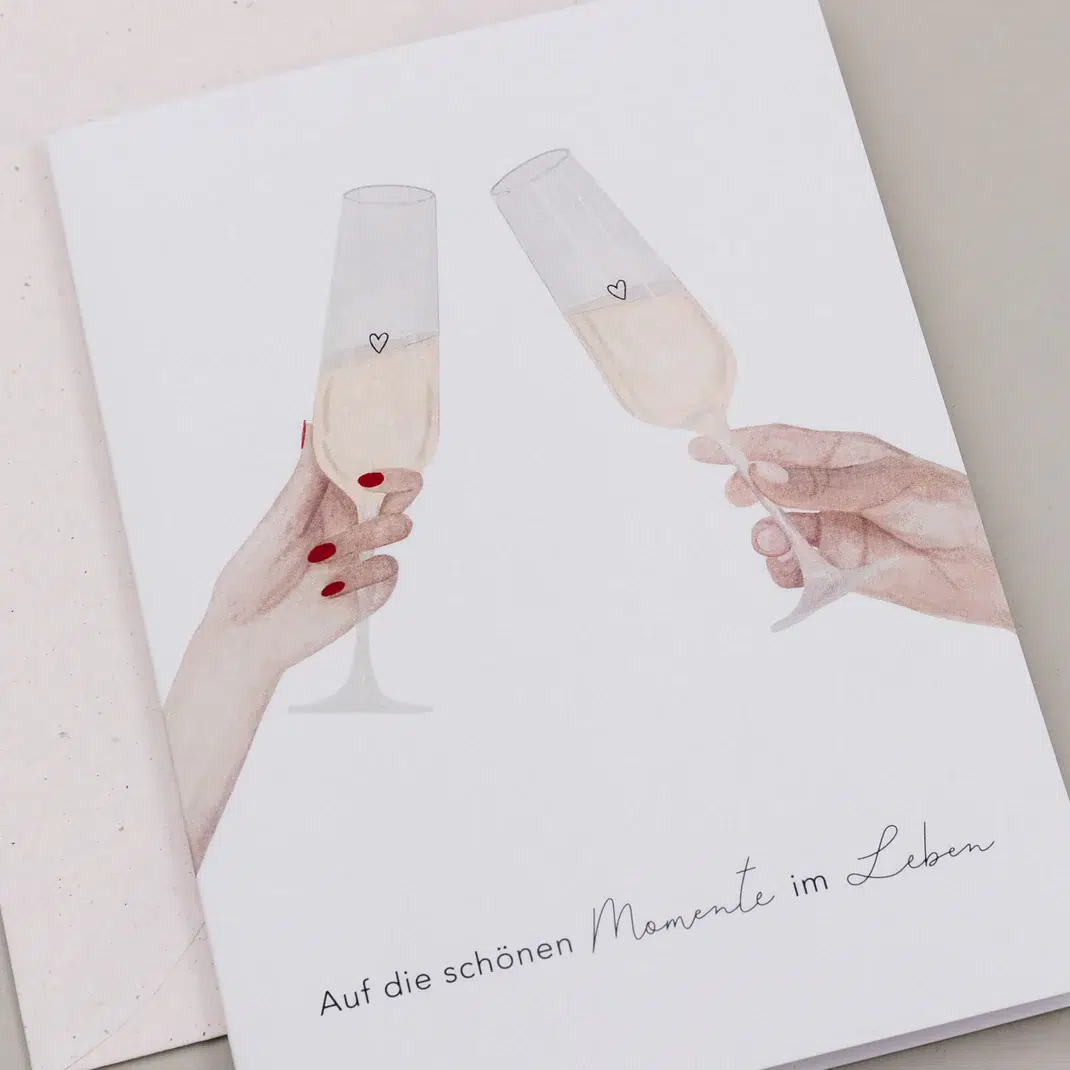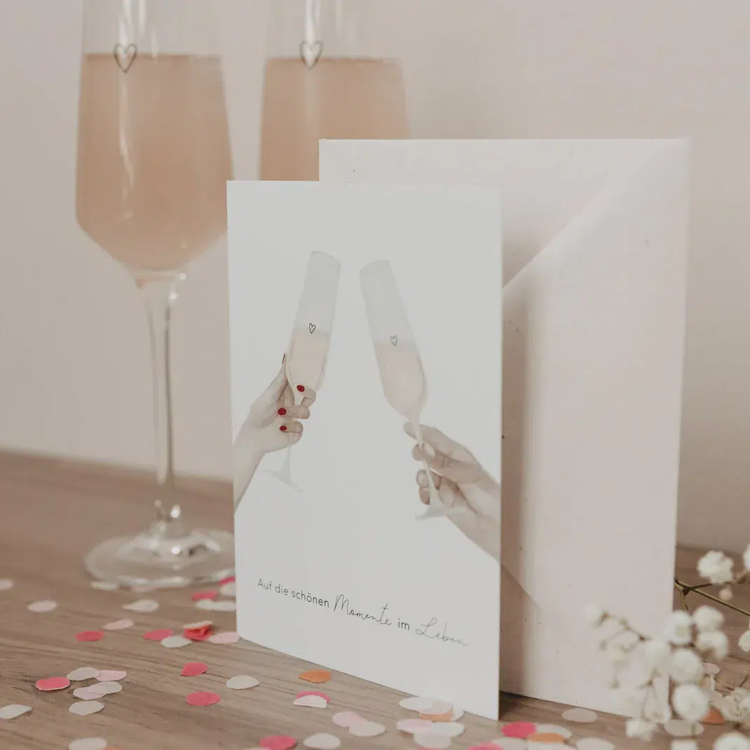 Die liebevolle Illustration zeigt zwei Sektgläser, die von zwei Händen gehalten und gerade miteinander angestoßen werden. Diese symbolische Geste steht für Freude, Feier und gemeinsame Momente. In Hamburg von unserem Designteam gestaltet und in Deutschland produziert, vereint sie hochwertiges Design mit einer besonderen Botschaft.