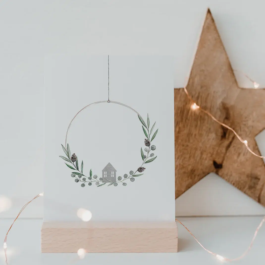 Unsere Aquarellkarte Christmas Wreath, ist jetzt auch ohne Text erhältlich und wurde mit viel Liebe von uns designt und in Deutschland hergestellt. Im Digitaldruckverfahren werden unsere Aquarellkarten auf 400g matt lackiertem Papier gedruckt. Die Rückseite ist blanko mit einem kleinen Eulenschnitt-Logo verziert, sodass Du noch viel Platz zum Beschreiben der Postkarte vorfindest.